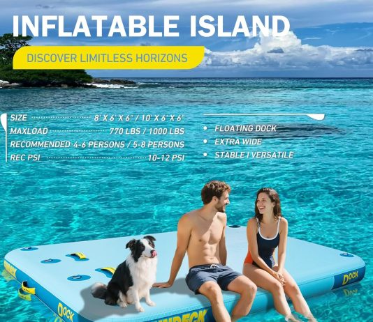 AWSUM Inflatable Floating Dock review: ten-minute setup, sturdy PVC, non-slip EVA, portable carry bag, anchored stability—ideal for lazy lake afternoons. Now!!!